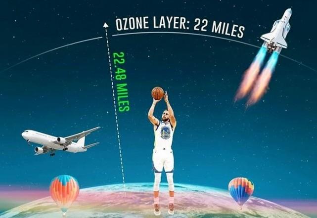 足球直播吧讯 北京时间7月25日,美媒clutchpoints晒图公布了一项有趣的数据,勇士球星斯蒂芬-库里生涯投篮命中的总距离达到22.48英里(约36178米),而地球表面的臭氧层高度大概是22英里(约35405米)。美媒调侃,库里的进球总距离已经可以冲破臭氧层了。