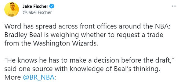 足球直播吧讯 据NBA记者JakeFischer报道,奇才后卫布拉德利-比尔正在考虑在选秀大会前提出交易申请,若比尔最终决定申请离队,凯尔特人、勇士、热火、猛龙、独行侠和费城都将加入比尔争夺战。