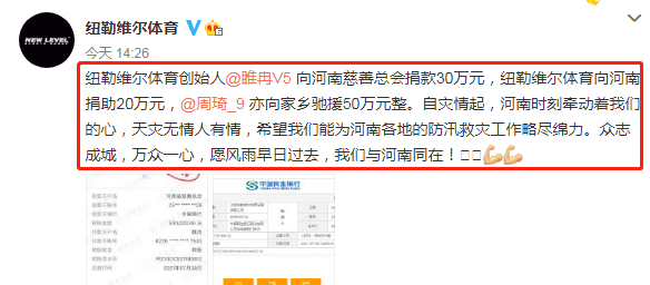 “纽勒维尔体育创始人睢冉向河南慈善总会捐款30万元,纽勒维尔体育向河南捐助20万元,周琦亦向家乡驰援50万元整。自灾情起,河南时刻牵动着我们的心,天灾无情人有情,希望我们能为河南各地的防汛救灾工作略尽绵力。众志成城,万众一心,愿风雨早日过去,我们与河南同在”。周琦经纪公司写道。