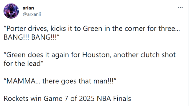 火箭还没正式选走格林,已经有球迷为他P上火箭球衣,还有球迷开始畅想2025年总决赛上,火箭能够在格林和波特的率领下成功夺冠。“波特突破,把球传给底角的格林,格林三分命中!又一个关键球,帮助火箭取得领先,最终火箭赢下2025年总决赛的第7战。”一个球迷写道。