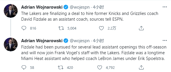 此前基德和独行侠签下4年执教合同,从而离开湖人,由于助教团多了一个空缺,最终湖人聘请菲兹戴尔担任助教,他曾作为热火助教随队两次夺冠,现在与詹姆斯重聚;菲兹戴尔曾执教过尼克斯和灰熊两支球队。