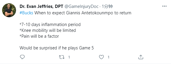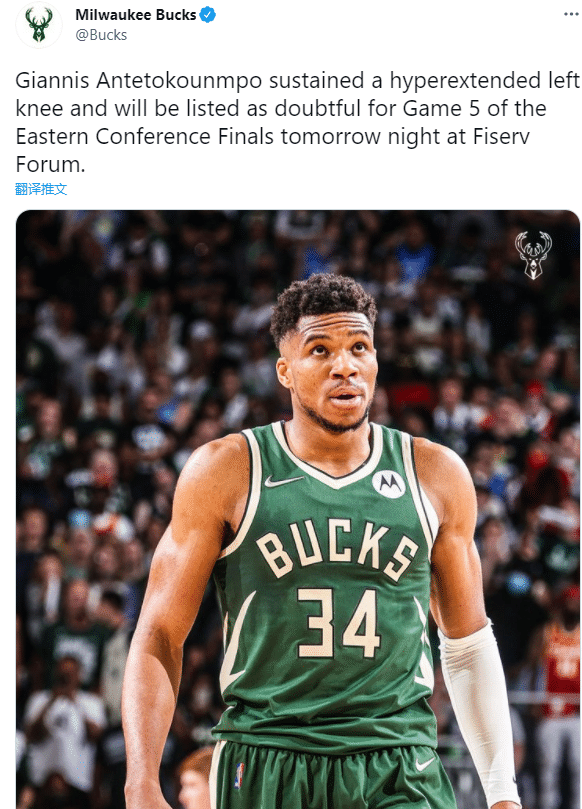 字母哥逃过一劫,雄鹿官方已经更新伤情——字母哥遭遇左膝过度伸展,东决G5出战成疑(25%%小概率出战);目前雄鹿和老鹰打成2-2平,G5天王山之战十分关键,赢者将更有机会杀进总决赛。