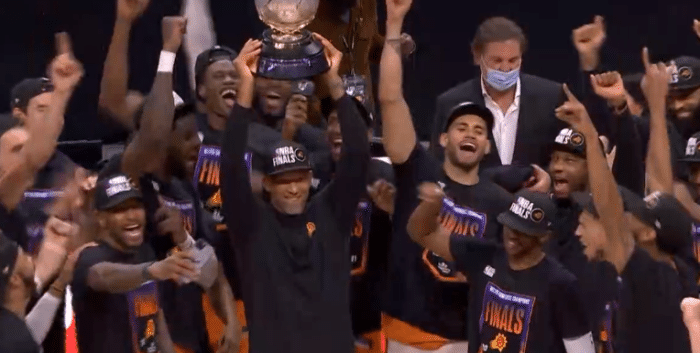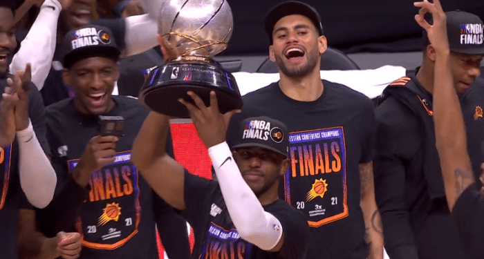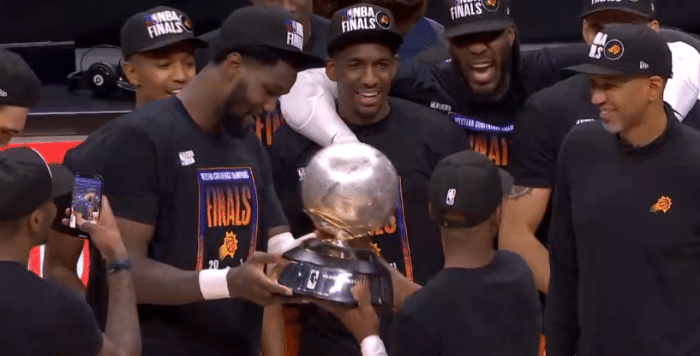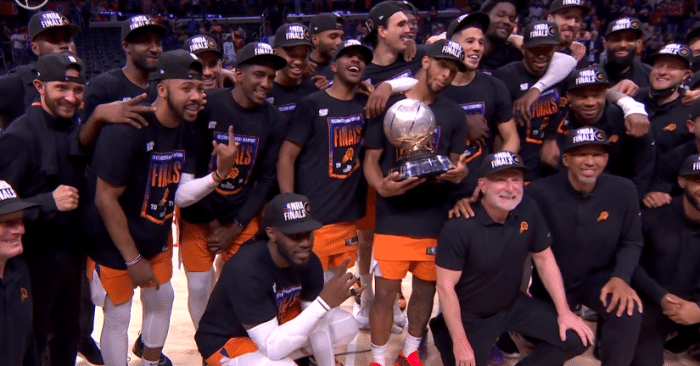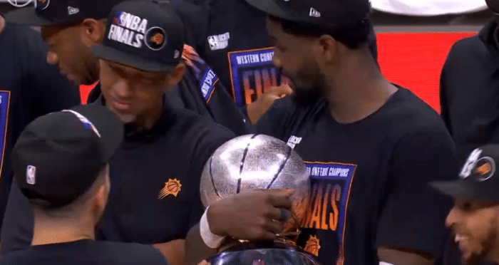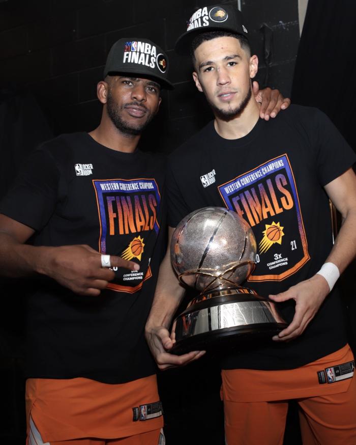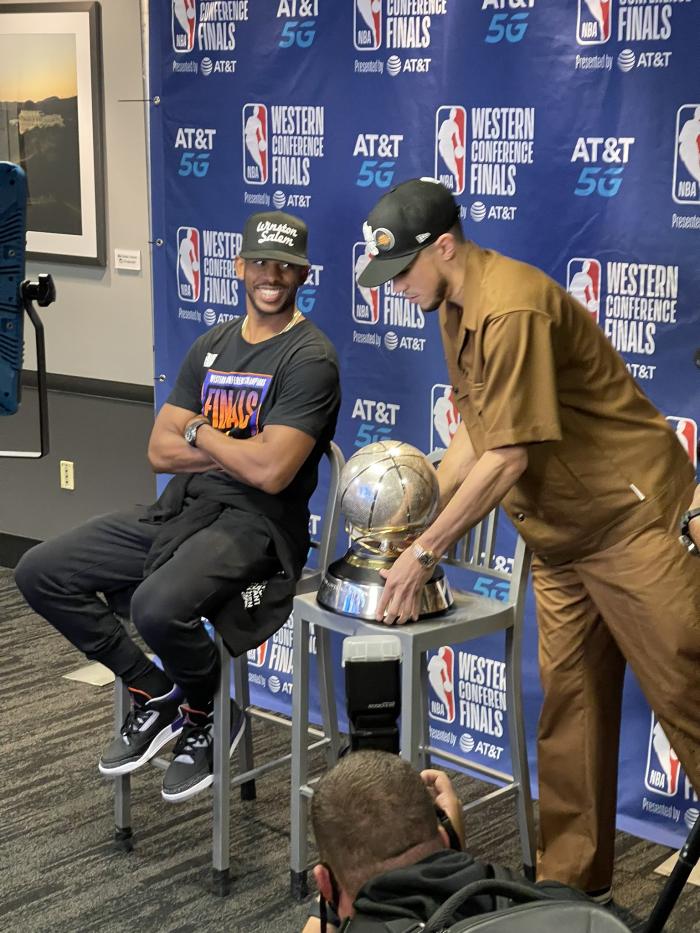 回到更衣室后,太阳两大核心合影留念——布克抱着西部冠军奖杯,保罗搂着布克并且指着奖杯;赛后保罗再次接受采访时,布克把西部冠军奖杯搬到发布会现场,放在保罗身旁。