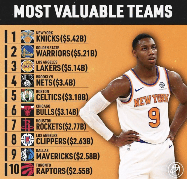 接下来,我们再来看看蔡老板第二块赚钱的地方,那就是球队市值的提升,因为有了杜兰特、哈登、欧文的三巨头,篮网队已经成为了本赛季市值飙升最快的球队,相比上赛季,篮网队的市值增加了9000万美元,如今这支球队的市值已经达到了34亿美元,首次杀入了NBA前四。