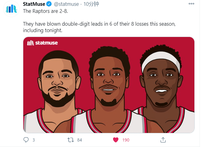在输掉这场比赛后,猛龙以2胜8负的战绩与活塞并列联盟倒数第一!据美媒statmuse统计,在输掉的8场比赛中,猛龙有多达6场是在领先两位数的情况下被逆转!可以说是本赛季当之无愧的崩盘之王!