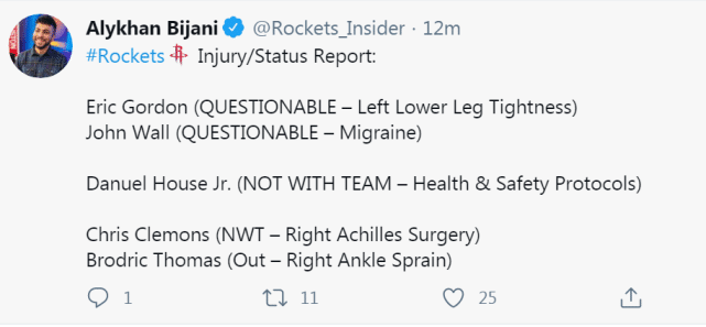 足球直播吧讯 北京时间1月12日,火箭队进行训练,备战和湖人的第二场比赛。对于火箭来说,他们的首发可能会有所变化。据主帅赛拉斯在采访中透露,沃尔由于偏头痛缺席了今天的训练,明天的比赛是出战成疑(questionable,50%上场概率)的状态,而此前由于背部痉挛连续缺席4场比赛的豪斯,出现了新状况,他将因健康安全协议接受隔离,预计缺席更多的比赛。