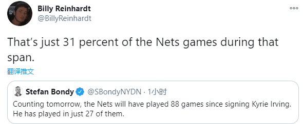 《纽约每日新闻》记者Stwfan Bondy统计,自从加盟以来,篮网总共打了88场比赛,欧文仅仅只打27场比赛;篮网记者Billy发推,在这段时间里,欧文的出勤率仅仅只有31%;Billy还建议欧文针对自己的情况发表一份声明,至少让外界知道他的真实情况。