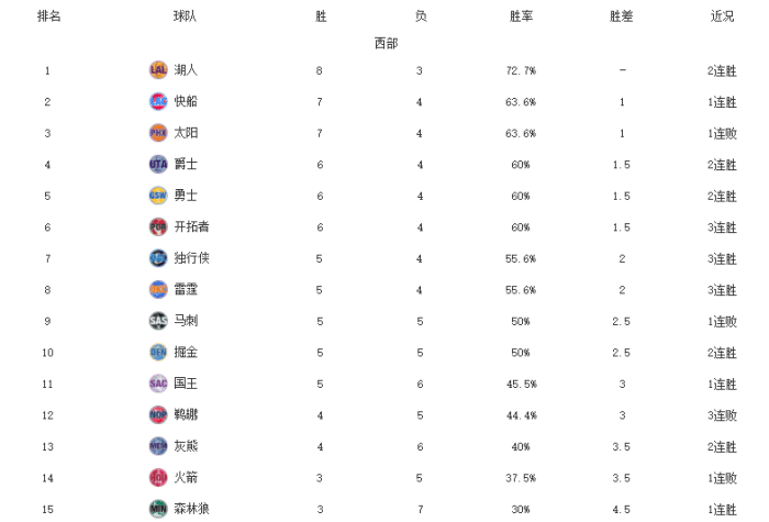 因为昨天火湖大战赢球和今天太阳输球,湖人在西部霸占榜首,一骑绝尘。快船昨天也拿下了胜利,止住了被勇士逆转的颓势。太阳今天输给奇才非常可惜,布克空砍33分。爵士近期取得了2连胜,他们的本赛季拿下了6场胜利。勇士昨天以1分优势险胜猛龙,达米恩李完成了罚球准绝杀的好戏,再度拯救球队。开拓者面对猛龙,依靠着考文顿最后时刻的单防和麦科勒姆的关键三分球,开拓者逆转猛龙。独行侠近期一波3连胜让他们能直接冲入前八。雷霆绝对是西部最大的惊喜,被认为摆烂的他们拿下了3连胜。