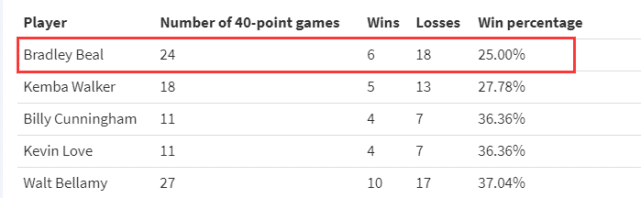 足球直播吧1月11日讯 轰下40+的分数,球队却赢不了球,这显然是一件令人扎心的事。本赛季至今,奇才球星比尔两次得分突破40分,球队却都输了比赛,把上赛季也算上的话,近两年,比尔有12场比赛得分40+,奇才竟然输了其中11场。近日,美媒HoopsHype公布了一份历史球星40+得分的胜率排行榜,比尔排名倒数第一。