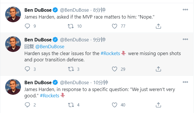 哈登同样谈到了转换进攻方面的糟糕表现,他表示:球队只是打得不好,这场比赛球队缺少空位投篮的机会,而且在转换防守中做得太差。此外,哈登也谈到了自己在MVP的竞争中处于落后,但他觉得这不重要。显然,按照哈登和火箭目前的状态,想要争夺MVP已经不可能了。