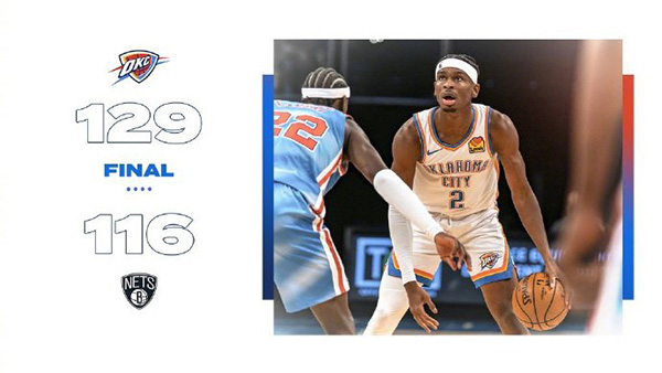 篮网116-129不敌雷霆 亚历山大31+7+6 杜兰特36+11