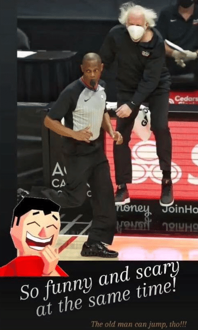 足球直播吧1月10日讯 近日波波维奇吸引了不少人的关注,这位72岁的老帅已经达成了执教NBA场次1900场里程碑时刻,位居历史第9,虽然已经72岁高龄了,但波波维奇在场边依旧激情四射,本赛季还有因为质疑判罚被驱逐出场的时候。波波维奇在场边激动的画面也在网络上走红,主要是白发的波波维奇跳起来朝着裁判抱怨,甚至被自己的弟子吉诺比利恶搞调侃。