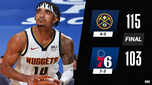 足球直播吧讯:北京时间1月10日消息,NBA常规赛继续进行。做客的掘金队经过四节较量以115-103轻取76人队,76人队遭遇2连败。