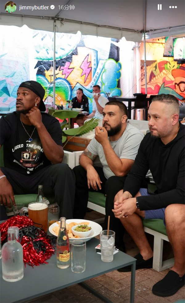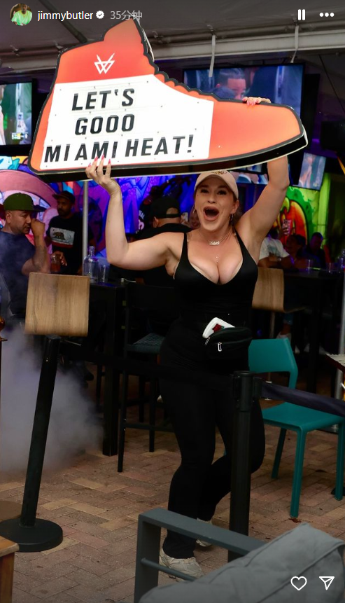 巴特勒还晒出自己庆祝胜利的画面——在酒吧中看比赛,热火获胜后巴特勒握拳以及鼓掌,还让现场美女举牌庆祝,大大的鞋型标牌上写着:“迈阿密热火,加油”,现场氛围太嗨了。