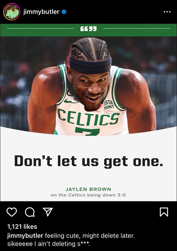 热火爆冷掀翻联盟第一的凯尔特人,巴特勒通过社媒挑衅绿军,巴特勒晒自己身穿绿军7号球衣的P照(就是把用自己的头挡住了布朗的头),并且借用杰伦-布朗的话“最好别让我们扳回一局”,配文写道:好好好,可能稍后就删,不不不,我才TMD不会删。