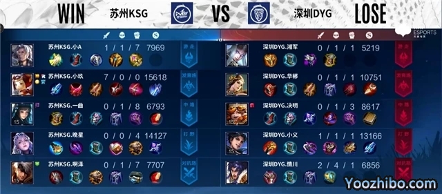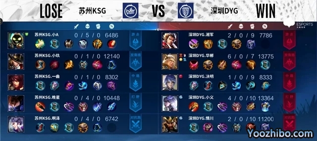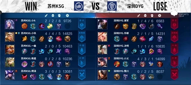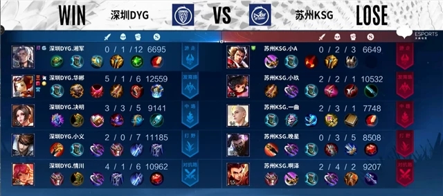 开局深圳DYG中路三人抢线。2分42秒中路团战深圳DYG击杀太乙真人,拿下一血。3分55秒中路团战深圳DYG击杀刘邦,拿下暴君。4分52秒主宰处深圳DYG击杀澜,苏州KSG摧毁敌方发育路外塔,深圳DYG摧毁敌方对抗路外塔。5分33秒暴君处深圳DYG击杀刘邦,摧毁敌方发育路外塔。6分14秒深圳DYG拿下主宰。8分02秒深圳DYG摧毁敌方发育路二塔,野区处团战打出0换1,拿下暴君。9分59秒中路团战深圳DYG击杀太乙真人,拿下暗影暴君,苏州KSG摧毁敌方对抗路外塔。10分47秒深圳DYG拿下暗影主宰。11分43秒深圳DYG摧毁敌方中路外塔,击杀澜,打出0换1。12分15秒野区团战深圳DYG后羿三连决胜,打出0换3,摧毁敌方中路二塔。13分40秒深圳DYG摧毁敌方对抗路二塔,发育路击杀澜,打出0换1。14分39秒深圳DYG拿下暗影主宰,15分19秒拿下暗影暴君。16分17秒中路深圳DYG击杀澜,摧毁敌方中路高地、对抗路高地,打出0换3,摧毁水晶拿下比赛。