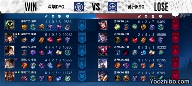 开局深圳DYG中路三人抢线。2分15秒苏州KSG拿下暴君。2分48秒中路苏州KSG击杀不知火舞,拿下一血。3分33秒野区深圳DYG击杀哪吒,拿下暗影主宰,苏州KSG摧毁敌方发育路外塔。5分13秒深圳DYG摧毁敌方发育路外塔,苏州KSG摧毁敌方对抗路外塔。6分18秒深圳DYG摧毁敌方对抗路外塔,苏州KSG拿下暴君,暴君处团战深圳DYG打出1换2。7分05秒中路团战苏州KSG击杀鲁班大师,打出0换1。9分01秒苏州KSG拿下主宰,中路团战击杀鲁班七号,打出0换1。10分17秒深圳DYG拿下暗影暴君,苏州KSG拿下暗影主宰。11分01秒中路深圳DYG击杀金蝉。11分38秒中路团战深圳DYG打出1换34,摧毁敌方中路外塔、中路二塔。13分26秒深圳DYG摧毁敌方发育路二塔,拿下暗影暴君。14分46秒深圳DYG击杀兰陵王,拿下暗影主宰,摧毁敌方对抗路二塔、中路高地。16分01秒野区团战深圳DYG鲁班七号三连决胜,打出0换5,团灭对手摧毁水晶拿下比赛。