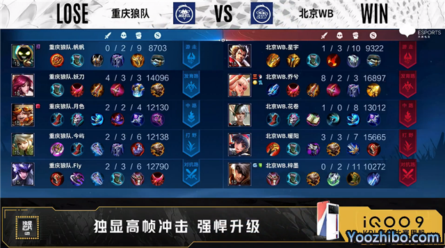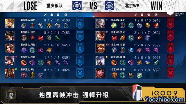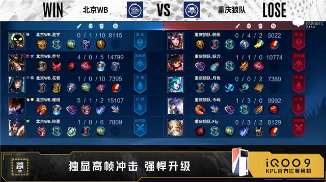 开局重庆狼队四人抢中。3分58秒重庆狼队对抗路击杀娜可露露拿到一血。4分36秒北京WB发育路击杀伽罗。4分48秒北京WB拿下暴君。5分18秒北京WB野区击杀马超。6分06秒重庆狼队对抗路击杀娜可露露。6分19秒北京WB摧毁敌方中路外塔并击杀沈梦溪。7分24秒北京WB拿下主宰。8分30秒重庆狼队野区击杀公孙离。9分15秒重庆狼队拿下暴君。10分20秒重庆狼队拿下暗影暴君,团战重庆狼队打出0换4。12分25秒重庆狼队拿下暗影主宰。13分38秒重庆狼队摧毁敌方发育路高地塔、中路二塔。14分39秒重庆狼队拿下暗影暴君。15分04秒中路团战北京WB打出1换4,公孙离拿到三连决胜。16分24秒主宰团战北京WB击杀阿古朵。16分41秒北京WB拿下暗影主宰。18分整北京WB摧毁敌方发育路高地塔,重庆狼队击杀夏侯惇。18分19秒北京WB拿下暗影暴君。20分56秒中路团战北京WB打出0换4。21分12秒北京WB团灭对手,21分23秒北京WB摧毁敌方水晶拿下比赛。