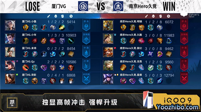 开局南京Hero五人中路抢线击杀公孙离拿到一血。1分43秒野区团战厦门VG打出0换2。2分42秒厦门VG中路击杀不知火舞。3分09秒厦门VG发育路击杀镜。4分55秒厦门VG拿下暴君。5分26秒南京Hero对抗路击杀马超。6分53秒厦门VG中路击杀鲁班大师。7分49秒厦门VG中路击杀镜。8分22秒厦门VG摧毁敌方发育路二塔。9分08秒南京Hero对抗路击杀马超。9分27秒主宰处团战厦门VG击杀夏侯惇。10分15秒发育路团战南京Hero打出1换2。11分34秒野区团战南京Hero打出0换3。12分08秒南京Hero摧毁敌方中路高地塔。15分10秒南京Hero拿下暗影暴君。15分43秒中路团战南京Hero打出0换3。16分08秒南京Hero团灭对手摧毁水晶拿下比赛。