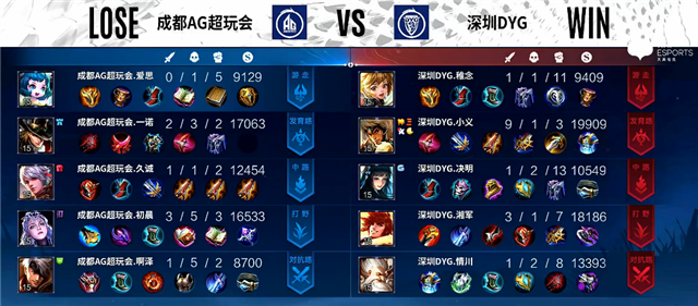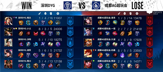 开局成都AG超玩会入侵野区拿下蓝Buff。2分40秒裴擒虎拿下主宰。3分30秒下路团战,沈梦溪拿下一血。4分37秒狄仁杰推掉下路一塔。5分钟裴擒虎拿下暴君。6分11秒裴擒虎推掉中路一塔。6分50秒裴擒虎拿下主宰。9分钟野区团战,深圳DYG打出1换2。9分40秒娜可露露拿下暴君。10分20秒裴擒虎拿下主宰。10分45秒河道团战,深圳DYG打出1换4,马可波罗推掉中路一塔。11分50秒裴擒虎拿下暴君。15分10秒娜可露露拿下主宰,张飞被击杀。15分50秒裴擒虎拿下暴君。18分钟中路团战,深圳DYG打出1换2。18分50秒马可波罗推掉上路高地塔。19分钟野区团战,双方2换2,娜可露露拿下主宰。22分24秒娜可露露拿下风暴龙王,团战深圳DYG打出0换2。23分钟高地团战,双方3换3。25分40秒娜可露露拿下风暴龙王。28分50秒上路团战,成都AG超玩会2换5团灭深圳DYG。30分钟风暴龙王团,深圳DYG打出0换2。30分37秒深圳DYG推掉水晶追回一分。