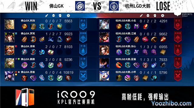 双方常规开局。2分22秒佛山GK拿下暴君,杭州LGD大鹅拿下主宰。5分35秒佛山GK发育路击杀虞姬拿到一血。5分47秒佛山GK发育路击杀盾山。6分35秒中路团战佛山GK打出2换3。8分17秒佛山GK拿下暴君,杭州LGD大鹅拿下主宰。8分51秒双方野区1换1。10分14秒佛山GK拿到暗影主宰,团战佛山GK打出0换2。11分03秒佛山GK拿下暗影主宰。13分42秒佛山GK摧毁敌方对抗路二塔。14分02秒佛山GK拿下暗影暴君。14分56秒佛山GK拿下暗影主宰并击杀夏侯惇。15分26秒佛山GK摧毁敌方中路二塔。15分45秒佛山GK发育路击杀镜。16分14秒佛山GK摧毁敌方中路、发育路高地塔。17分44秒佛山GK拿下暗影主宰并在中路击杀夏侯惇。20分20秒对抗路团战佛山GK打出1换5。20分43秒佛山GK摧毁敌方水晶拿下比赛。