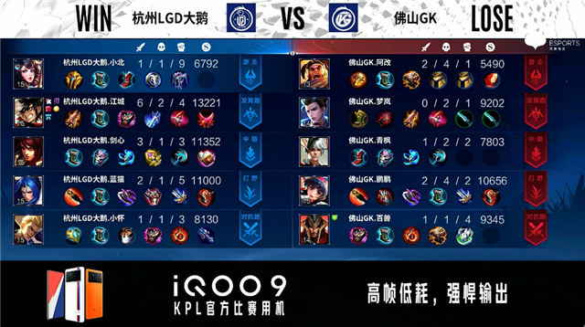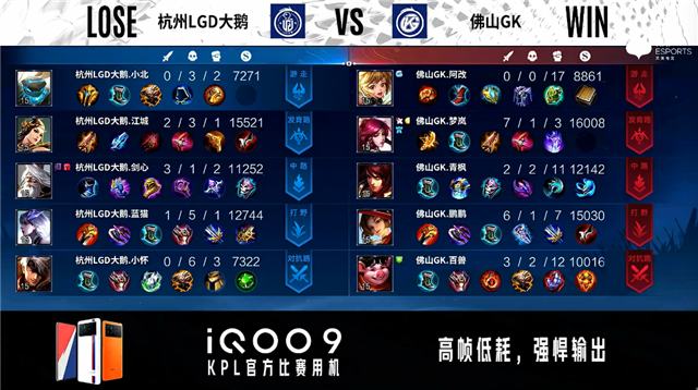 开局佛山GK选择边路换线。1分59秒发育路团战杭州LGD大鹅打出2换3,佛山GK拿到一血。3分45秒杭州LGD大鹅发育路击杀嬴政。4分08秒杭州LGD大鹅拿下主宰。5分16秒双方对抗路1换1。6分50秒对抗路团战杭州LGD大鹅打出1换3。7分52秒杭州LGD大鹅摧毁敌方中路外塔。8分50秒佛山GK拿下暴君,8分52秒杭州LGD大鹅野区击杀苏烈。9分28秒杭州LGD大鹅摧毁敌方中路二塔。10分18秒杭州LGD大鹅拿下暗影主宰。12分27秒杭州LGD大鹅拿下暗影暴君。13分16秒杭州LGD大鹅中路击杀娜可露露。13分29秒杭州LGD大鹅摧毁敌方发育路高地塔。13分58秒杭州LGD大鹅摧毁敌方中路高地塔。14分14秒杭州LGD大鹅拿下暗影主宰。15分34秒杭州LGD大鹅摧毁敌方水晶拿下比赛。