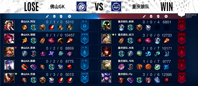 1分30秒重庆狼队强攻下路一塔,鬼谷子击杀沈梦溪,上路同时交火,镜拿下一血。2分17秒娜可露露拿下暴君。5分03秒镜被击杀。6分07秒下路团战,佛山GK打出0换2。6分11秒镜推掉上路一塔。7分钟娜可露露拿下暴君。7分38秒重庆狼队上路一塔被破。8分15秒中路团战,佛山GK团灭重庆狼队,娜可露露拿下四杀,马可波罗推掉中路一塔。10分20秒娜可露露拿下主宰。12分钟娜可露露拿下暴君。14分38秒娜可露露拿下主宰。15分05秒吕布推掉上路高地塔。15分30秒佛山GK强推中路高地塔,双方1换1。16分33秒周瑜拿下暴君。17分30秒佛山GK推掉下路高地塔。18分02秒佛山GK推掉水晶追回一分。