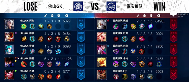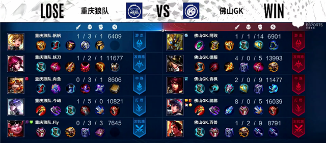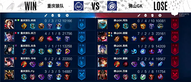 1分15秒公孙离击杀鲁班七号拿下一血。4分10秒盘古拿下主宰。5分15秒双方互换边路一塔。5分40秒暴君团,澜拿下暴君,元歌被击杀。6分20秒野区团战,重庆狼队打出1换2。8分15秒盘古拿下主宰。9分17秒元歌推掉下路二塔。9分55秒公孙离被击杀。10分33秒澜拿下暴君。11分10秒河道团战,佛山GK打出2换3。12分20秒盘古拿下主宰。13分30秒河道团战,重庆狼队打出1换3。14分09秒重庆狼队推掉水晶率先拿下赛点。