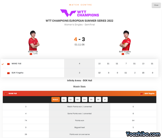 • 【赛事名称】: 2022世乒联冠军赛(布达佩斯站)女单半决赛 王艺迪vs孙颖莎 全场录像回放