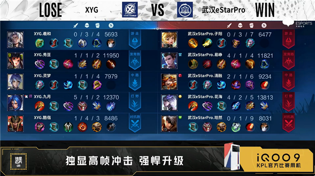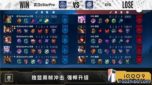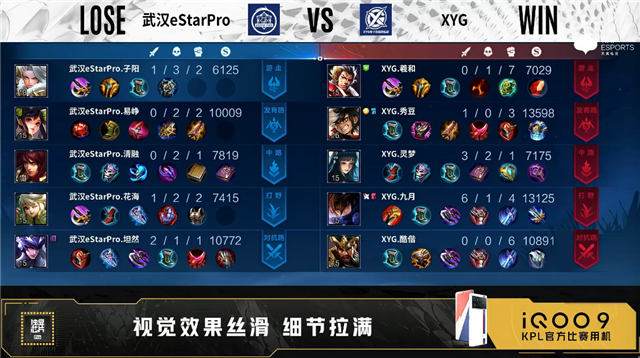双方常规开局。1分15秒XYG对抗路击杀马超拿到一血。2分23秒XYG拿下暴君。2分42秒XYG中路击杀钟无艳。3分34秒双方对抗路1换1。4分45秒武汉eStar拿下主宰。5分48秒XYG野区击杀钟无艳。6分30秒XYG拿下暴君。9分09秒XYG拿下主宰。10分20秒发育路团战XYG打出1换2。10分41秒XYG野区击杀阿古朵。10分52秒XYG拿下暗影主宰。11分06秒XYG摧毁敌方中路外塔。12分22秒XYG拿下暗影暴君。12分54秒XYG摧毁敌方对抗路二塔。14分42秒XYG拿下暗影主宰。15分46秒高地团战XYG打出2换3摧毁敌方水晶拿下比赛。