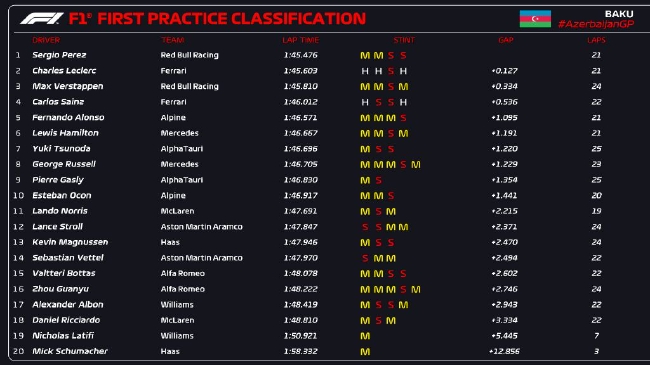 足球直播吧讯 2022年F1阿塞拜疆大奖赛第1次练习赛在巴库赛道结束,去年的阿塞拜疆大奖赛冠军得主佩雷兹以1:45.476排名第一,勒克莱尔落后0.127秒排名第二,维斯塔潘落后0.334秒排名第三,塞恩斯和阿隆索分列四五。排名六至十位的车手分别是汉密尔顿、角田裕毅、拉塞尔、加斯利、奥康。