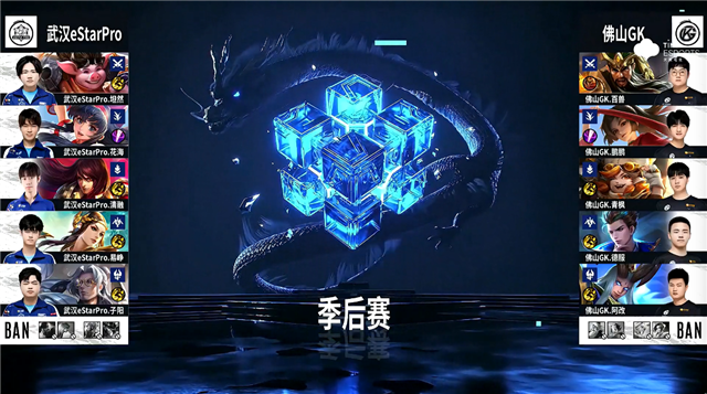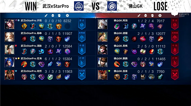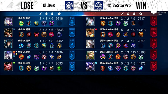 开局武汉eStar入侵野区反掉一组野怪。2分15秒佛山GK暴君处打出0换2。2分30秒佛山GK拿下暴君。4分05秒佛山GK发育路击杀姜子牙。5分14秒武汉eStar拿下主宰。7分08秒中路团战双方3换3。8分10秒野区团战佛山GK打出3换5,镜拿到四连超凡。10分25秒佛山GK拿下暗影暴君。11分57秒佛山GK拿下暗影主宰。12分56秒佛山GK摧毁敌方对抗路二塔。14分03秒佛山GK摧毁敌方中路二塔。14分36秒佛山GK拿下暗影暴君。15分50秒佛山GK摧毁敌方发育路二塔,武汉eStar摧毁敌方对抗路二塔。16分12秒佛山GK拿下暗影主宰。16分46秒野区团战武汉eStar打出1换3。17分18秒武汉eStar摧毁敌方中路二塔。17分35秒野区团战武汉eStar打出1换2。19分02秒野区团战武汉eStar打出2换5。19分52秒武汉eStar摧毁敌方水晶拿下比赛。