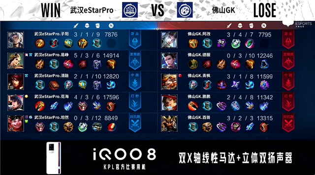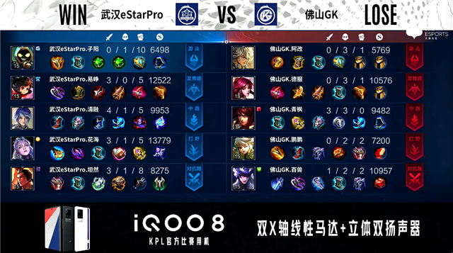 双方常规开局。2分15秒武汉eStar拿下暴君。2分30秒武汉eStar蒙恬野区单杀貂蝉拿到一血。4分01秒武汉eStar对抗路击杀貂蝉。4分20秒武汉eStar拿下主宰。6分37秒武汉eStar拿下暴君。7分30秒佛山GK对抗路击杀蒙恬。8分41秒武汉eStar拿下主宰。9分44秒佛山GK对抗路击杀老夫子。10分47秒暴君处团战武汉eStar打出1换2,佛山GK拿下暗影暴君。11分整武汉eStar摧毁敌方中路外、二塔。12分25秒武汉eStar摧毁敌方发育路二塔。15分02秒武汉eStar拿下暗影暴君。15分42秒武汉eStar拿下暗影主宰。16分48秒中路团战武汉eStar击杀貂蝉。17分24秒高地团战武汉eStar打出1换2。18分20秒高地团战武汉eStar打出1换3。18分44秒武汉eStar摧毁敌方水晶拿下比赛。