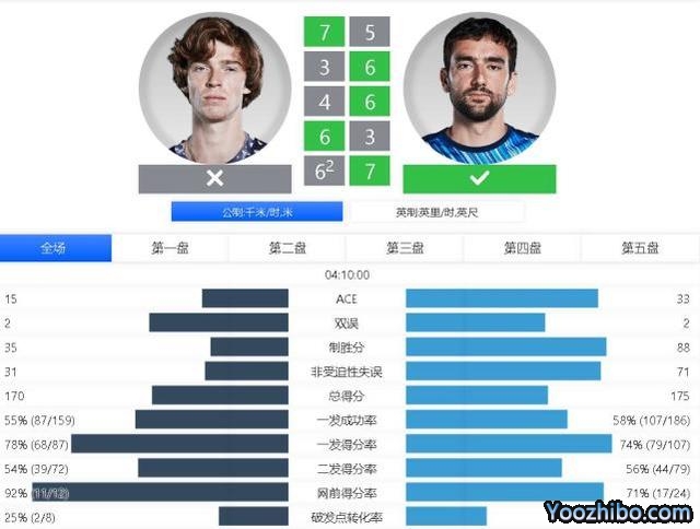 首盘第7局西里奇挽救3个破发点,第9局他化解2个连续破发点保发。卢布列夫在第11局完成关键破发,随后love game保发7-5赢下首盘。 第二盘西里奇第2局率先破发,开局3-0领先。第6局卢布列夫挽救破发点保发,第9局西里奇在第5个盘点兑现,6-3赢下第二盘。