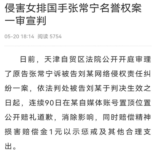 这是根据天津市高级人民法院报道,称天津自贸区法院公开开庭审理了张常宁起诉刘某网络侵权责任纠纷一案,张常宁胜诉,刘某要从宣判日开始,连续90天在自媒体账号上置顶公开赔礼道歉,消除影响,同时赔偿精神损害赔偿金1元以示惩戒及其他合理支出。