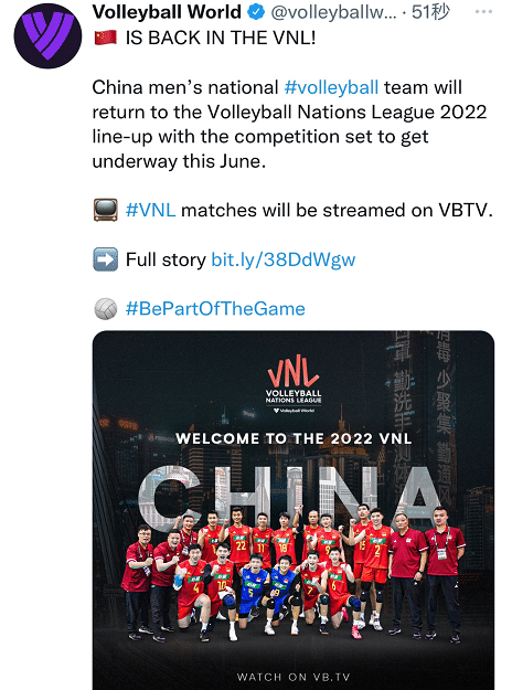 足球直播吧04月30日讯 晚上,中国男排传来重大利好消息,国际排联发文确认:中国男排重返2022年世界男排联赛,开赛时间是今年6月份。这样中国男排正式取代俄罗斯队,出战接下来的世界男排联赛,这对于中国男排来说是非常好的事情。