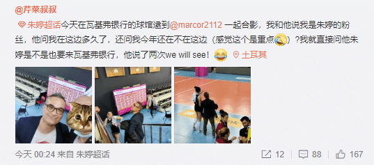 这是有球迷在社交媒体上发文,他表示:“天在瓦基弗银行的球馆逮到marcor一起合影,我和他说我是朱婷的粉丝,他问我在这边多久了,还问我今年还在不在这边(感觉这个是重点)?我就直接问他朱婷是不是也要来瓦基弗银行,他说了两次we will see。”