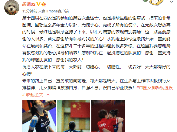 “第十四届在西安是我参加的第四次全运会,也是排球生涯的谢幕战,结束的非常圆满。回想这么多年全力以赴,无愧于心,完成了所有的使命,在无数次想放弃的时候,最终还是咬牙坚持了下来,以相对满意的表现告别赛场!这一路需要感谢的人很多,首先感谢所有领导对我的关心!从我走上排球这条路开始一直到能站在最高领奖台,在这奋斗二十多年的过程中遇到很多教练,在这里我要感谢所有教练对我的悉心指导和培养!感谢跟我在一起拼搏过的队友们!感谢一直支持我的球迷朋友们!感谢我的家人!