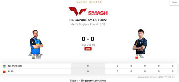 足球直播吧讯 北京时间3月14日,WTT新加坡大满贯男单16强赛继续进行,国乒选手许昕遇上瑞典选手佩尔森,这场比赛第一局11-9,第二局16-14,第三局11-6,最终许昕晋级16强。虽然是3-0横扫但第二局太惊险了,许昕14-14后彰显了大心脏。