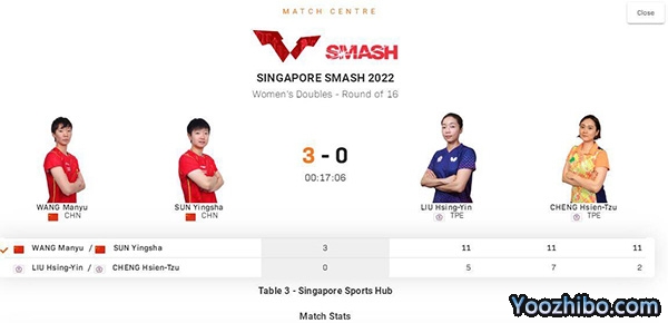 - 【赛事名称】: 2022WTT新加坡站大满贯正赛女双1/8决赛 王曼昱/孙颖莎vs郑先知/刘馨尹 全场录像回放