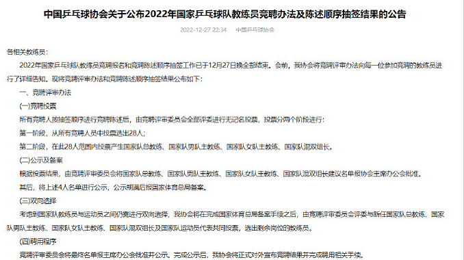 所以针对巴黎奥运会周期,国乒进行公开教练竞聘,希望的是可以在这两年多的时间内,在国际大赛有好的表现,最终极的目标是要在巴黎奥运会取得好成绩,如果期间战绩不佳、球员受伤等因素,负责的教练员将承担相应的责任。