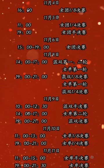 孙颖莎在本届全锦赛的压力也是非常大的,根据赛程显示,孙颖莎将会身兼三项,出战团体、混双和女单,冲击三冠王。2020年的时候孙颖莎率领河北队在决赛中击败陈梦领衔的山东队,时隔30年斩获全国冠军。同时孙颖莎在3年前也夺得过混双的全锦赛冠军。孙颖莎个人的赛程从11月4日-6日将会出战女团比赛,混双联手王楚钦,比赛时间是11月8日-9日,女单是11月8日-12日。