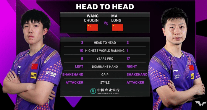 22岁的王楚钦世界排名第11名,此前连续淘汰前10名的选手雨果和。马龙刚度过了34岁生日,世界排名第二。两人也是双打的好搭档,连续夺得世锦赛冠军。