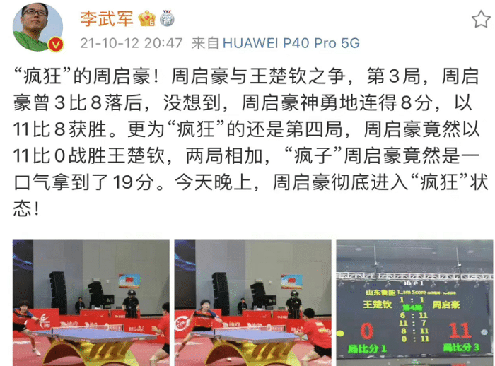 也正是在这场比赛结束之后,知名乒乓球记者李武军在社交媒体上盛赞周启豪是“疯狂的周启豪”,还晒出了现场的图片,这也引发很多王楚钦粉丝的不满。
