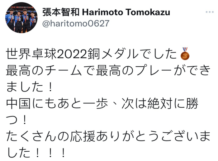 张本智和不忘继续放豪言,称:“世乒赛2022铜牌,我在最好的队伍里发挥了最好的水,距离中国队之间也只有一步之遥,下次一定要赢,谢谢大家的支持!!! ”