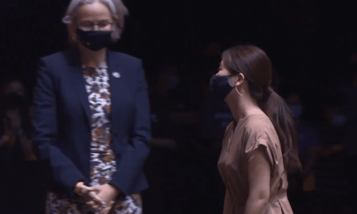 颁奖仪式上,刘国梁和福原爱颁奖,其中女单亚军王艺迪,福原爱上前颁奖。只见福原爱还是非常的端庄。作为中国乒乓球的老熟人,福原爱退役之后的生活变化也很大,这次来到新加坡担任颁奖嘉宾。