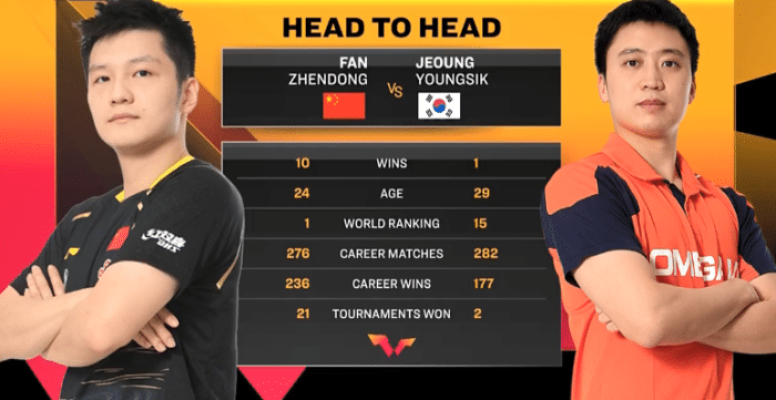 世乒赛的比赛,樊振东拿到男单冠军,本次世界杯的比赛,他在首场比赛击败弗朗西斯卡,进入8强。郑荣植在首轮比赛淘汰李尚洙,本场和樊振东的对决依然采用5局3胜的赛制,樊振东要尽快进入状态。两人最近一次交锋是奥运会,樊振东4比0击败郑荣植。两人交手11次,樊振东是10胜1负的成绩占优。