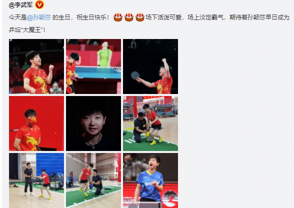 知名乒乓球记者李武军:今天是孙颖莎 的生日,祝生日快乐![蛋糕][蛋糕][蛋糕]场下活泼可爱,场上淡定霸气,期待着孙颖莎早日成为乒坛“大魔王”!
