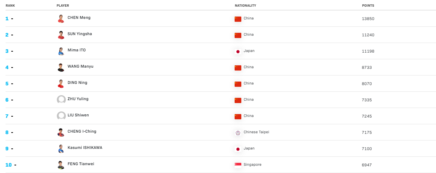 北京时间11月2日,WTT世界乒联公布了最新一周的世界排名。中国队在男单、女单两项拔得头筹,日本和韩国队则包揽了全部双打项目的头把交椅。