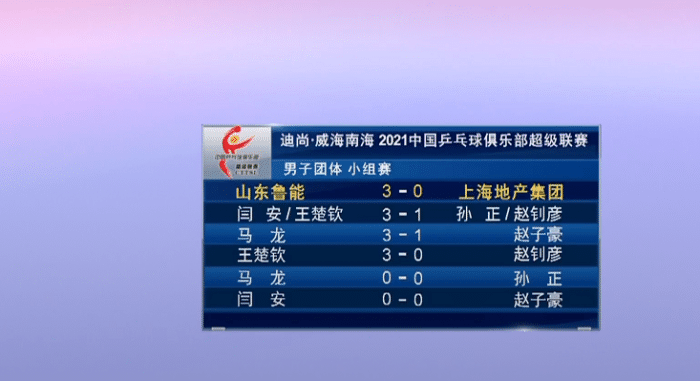 第二盘是男单,马龙以3-1击败赵子豪,虽然两人实力上有差距,但马龙的赢得并不轻松,在2-1领先的情况下比赛进入到第四局,马龙一度以7-10落后,赵子豪拥有3个局点。关键时刻马龙上演单局大逆转好戏,他连得5分,以12-10成功翻盘,3-1击败赵子豪,山东鲁能2-0领先上海房产。